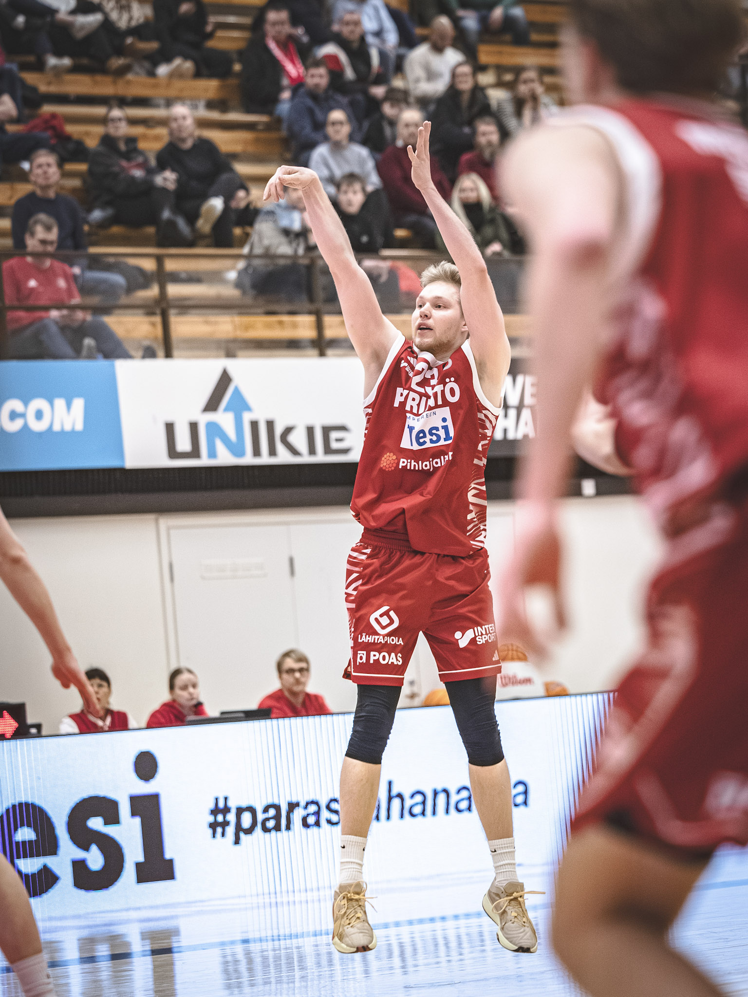 Mutta toisin kävi. Vilpas pisti painetta ja isoa iskua päälle ja alle neljässä minuutissa 0 – 13 ja tilanne 20 – 32. Jalen Brooks ja Samu Adler olivat avaintekijöinä Vilppaan karkumatkalla. Kotijoukkueelle pisteet olivat tiukassa. Topias Palmin kolmonen 23 – 32 avasi joukkueen pistesarakkeen vasta neljän ja puolen minuutin pelin jälkeen. Suurimmillaan eroa oli Brooksin kolmosen jälkeen 15 pistettä 23 – 38. Kun korinteko sakkasi oikein huolella, niin kaksi minuuttia ennen jakson loppua Pyrintö oli tehnyt vaivaiset kolme pistettä Vilppaan 19 vastaan. Pyrintö onnistui kuitenkaan tulemaan lähemmäksi, kun ensiksi Riley ja sitten Palmi heittivät kolmoset sisään. Riley viimeisteli vielä kakkosellaan Pyrinnön 7 – 0 runin lukemiin 31 – 38.